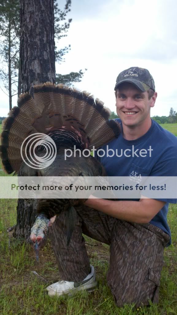 I've been hunting hard since Fri AM, and the birds have been absolutely silent. A buddy of mine in the club hunted this area yesterday and killed the boss, but he also heard a couple of other gobblers, so I knew birds were in there. I got in right at daylight, but as my luck would have it, the birds were silent. I setup in some thinned pines to just cold call for a little bit. This guy (I assume) sounded off around 7AM, but he was a ways off. He never sounded very interested, and only gobbled maybe 12 times all morning, but he came on in nonetheless. He popped up about 25yds away, but I was pointed in the wrong direction. I let him get behind a tree and moved, and then made a 40 yd shot and he backflipped and started flopping. I've never run a 40yd dash that fast! I didn't kill a bird last year and have passed a couple this year, so this was a great morning for me.